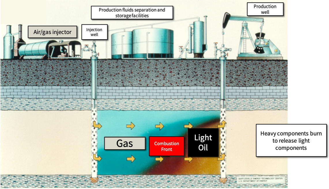 Enhanced oil recovery (EOR) typically involves applying heat, pressure, or a chemical solvent to a reservoir to increase the amount of oil recovered. In-situ combustion (ISC) is a form of thermal EOR where instead of injecting an external source of heat and/or pressure (e.g. steam), air is injected into the reservoir and the oil is burned in place. Lighter components of the oil are mobilized and pushed ahead of the combustion front where they are eventually recovered at the extraction well, while heavier components stay behind and burn: