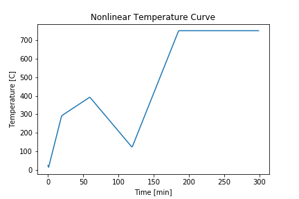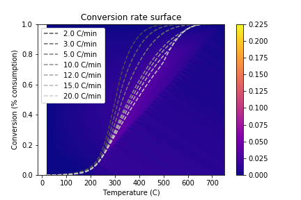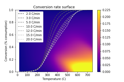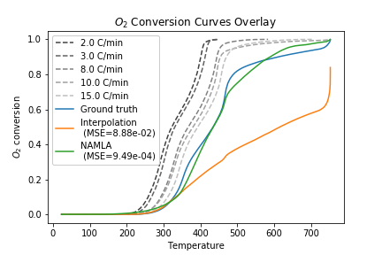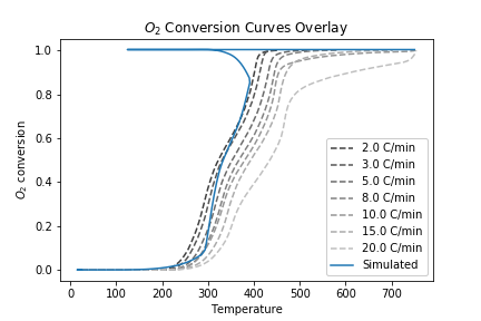 \[\begin{align*} C_{\text{O}_2}' = f(T, C_{\text{O}_2}) \end{align*}\]This predictive model can then be used with an ODE solver to generate conversion curves for an input temperature schedule.
