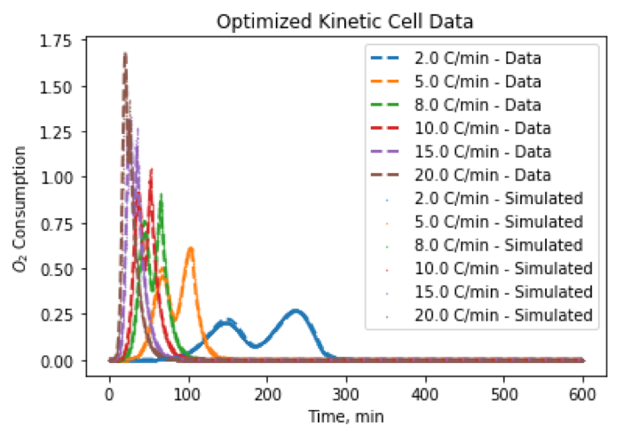 Our hope is that this work will allow us to create synthetic \(\text{O}_2\) consumption curves which can be used to improve fitting kinetics parameters to pseudocomponent chemical reaction models.