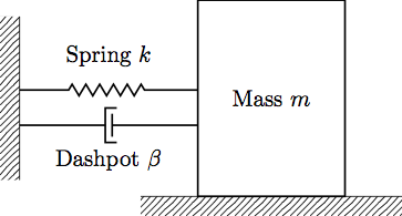 \[F_{dashpot} = -\beta v\]where \(v\) is the velocity of the object. That is, the force from the dashpot is always in the opposite direction of motion, and proportional to the velocity. A real life example of a dashpot is a plunger on a syringe: the faster you try to pull out the syringe, the more resistance it gives. However, in real-life systems a dashpot is just there to represent any form of friction, since friction force obeys this law.