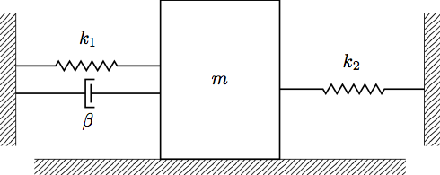 \[\begin{gather} mx'' = -k_1 x - \beta x' - k_2 x \\ m x'' + \beta x' + (k_1 + k_2 )x = 0 \end{gather}\]Notice that when we have multiple springs or dashpots, all of the damping terms and spring constants will group together with \(x'\) and \(x\), respectively.