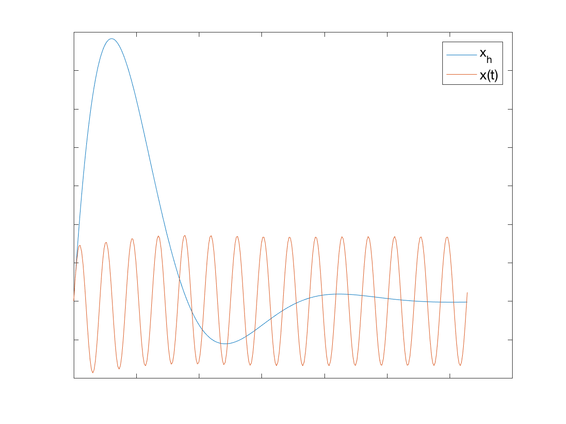 For Case 1, a sample solution is shown in the plot below. Notice how the solution is a superposition of the homogeneous and particular solutions, and the homogeneous solution decays over time.