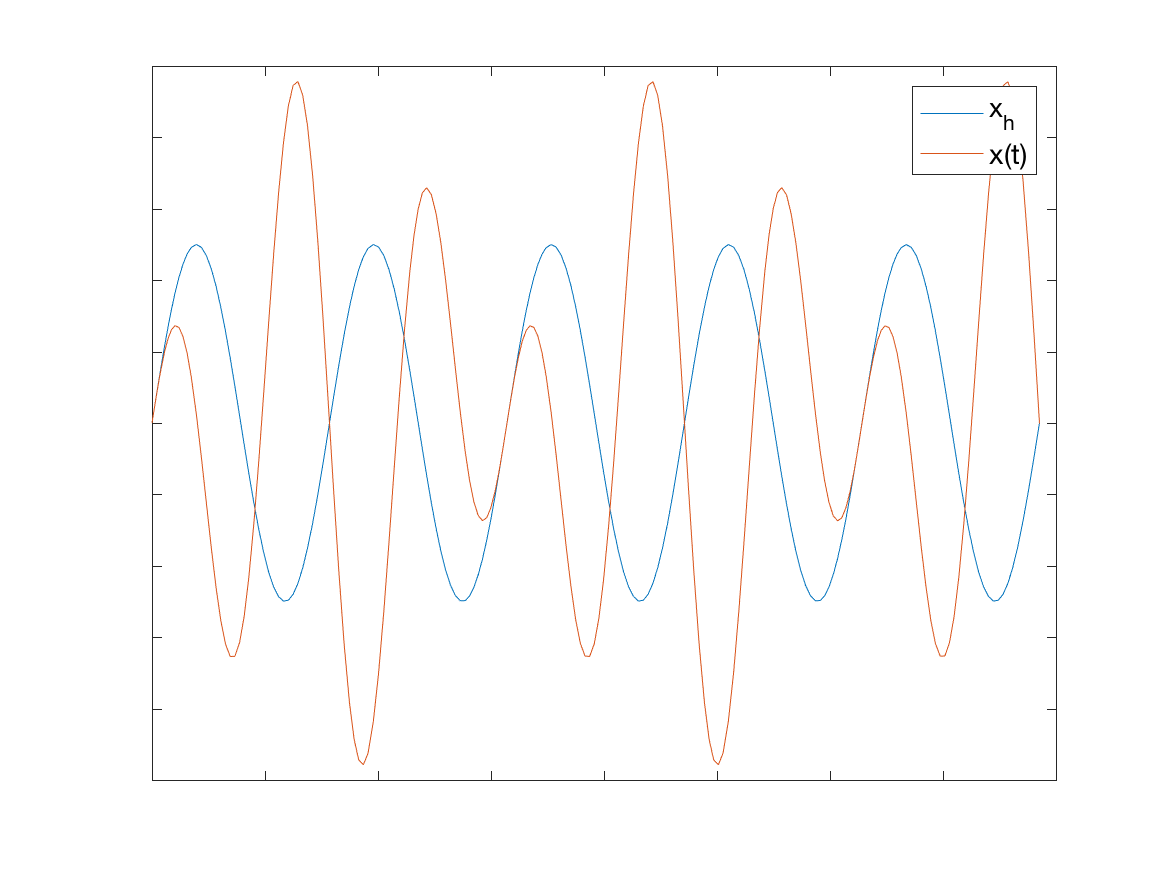 \[x_h(t) = C_1 \sin(\omega t) + C_2 \cos(\omega t)\]To solve for the particular solution, we use method of undetermined coefficients. However, \(r(t)\) here matches the homogeneous basis functions, so we need to apply the modification rule. Therefore, the particular solution will be of the form: