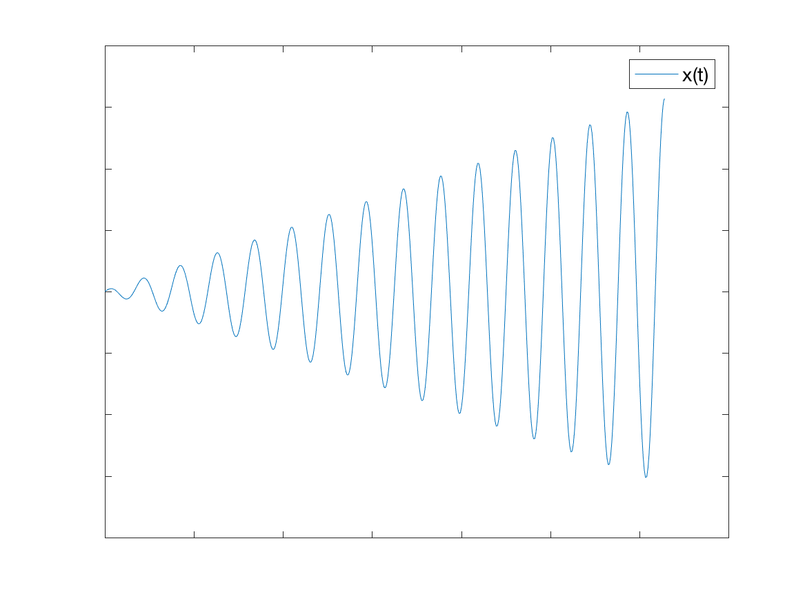 \[x_p(t) = A t \sin(\omega t) + B t \cos(\omega t)\]So, we see that the particular solution grows in time. (You can think of it as a sine/cosine with the amplitude growing in time.) This is why when we have resonance, the solution blows up. An example of resonance is shown in the plot below. When looking at a plot of a solution, it is easy to spot resonance because the solution will always be growing linearly in \(t\).