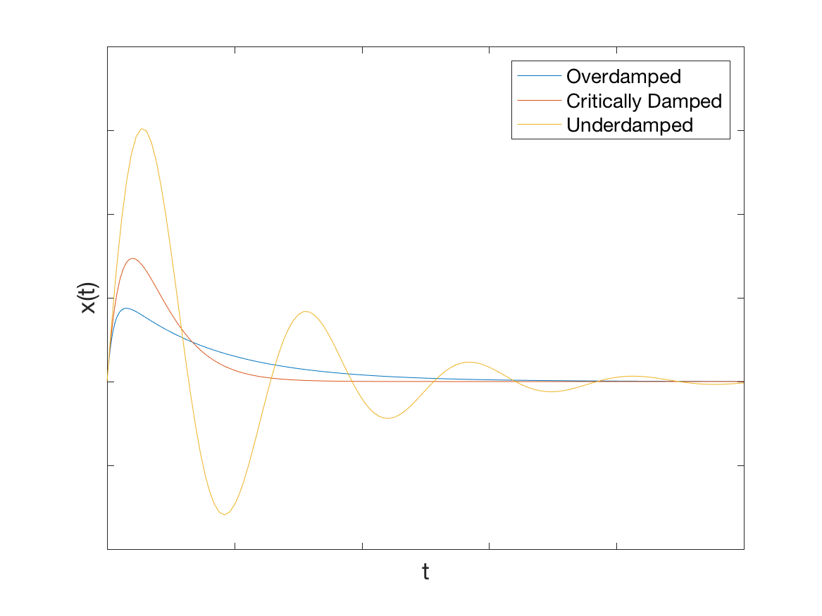 \[\lambda = -\mu \pm \sqrt{\mu^2 - \omega^2}\]This should look very familiar to when we were classifying solutions with characteristic equation (since we’re essentially doing this again). There are three main cases for damped (unforced) motion: